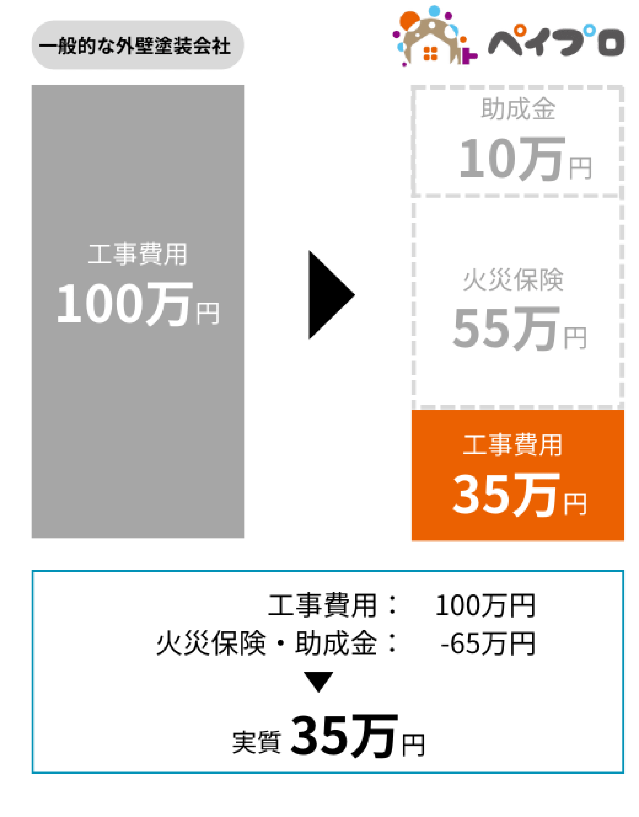 「ペイプロ」では無料で助成金や補助金の申請代行を行い、火災保険の申請も認定までサポートします。そのため工事費用が安くなります。