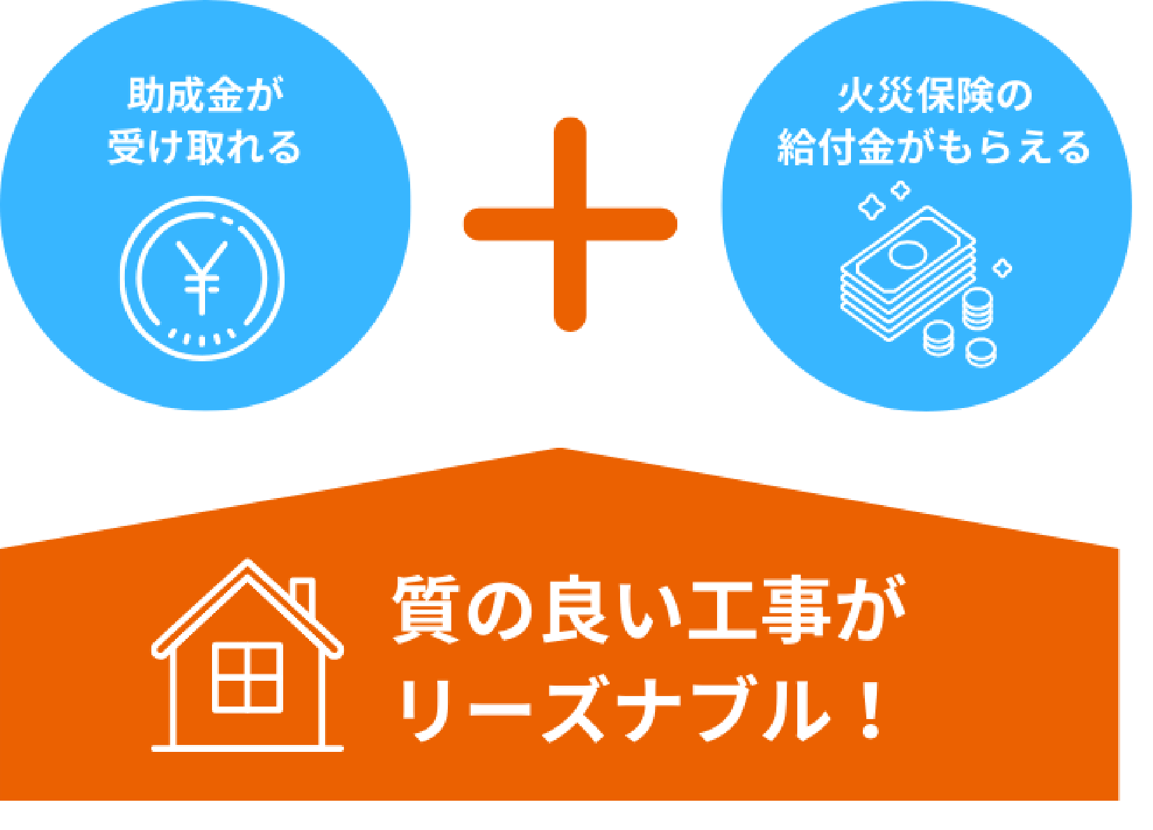 火災保険や助成金が受け取れます。もし受け取れなかった場合は、工事代金の一部をご返金致します。